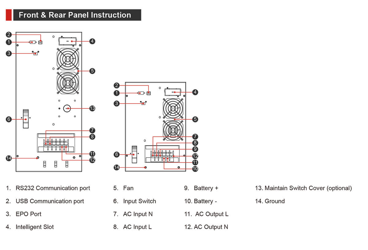 The EH5500 series is a new type high-frequency online UPS. Adopts advanced DSP digital control technology to effectively improve product performance and system reliability, and higher power density small size, light weight and high work efficiency. Effectively solve power problems such as power cut-off, Grid over voltage / low voltage, voltage instantaneous drop, amplitude reduction, high voltage pulse, surge voltage, harmonic distortion, clutter interference, frequency fluctuation and provide best power for load.