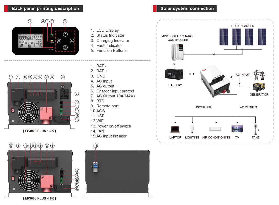 EP3000 PLUS series is a very economical pure sine wave inverter, with AC charger from 20A to 60A; Solar/AC priority is configurable, when setting solar priority, solar will charge batteries as first priority, and AC can also charge batteries when solar charger current is too lower . With pure copper transformer, it enables inverter to operate with all kinds of home appliances.