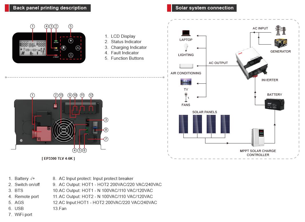 This split phase inverter EP3300 TLV series, capacity from 1KW-6KW, DC 12V/24V/48V, it’s applicable to 110VAC\120VAC markets demands, which matches AC 110VAC\120V single phase, or two phase 220V\240V; In LCD display, you can set output voltage, frequency, charging voltage, charging current to design best use based on different loads applications; meanwhile, you can also connect extra solar charge controller to build a solar home system, take use of sunshine freely and save electricity bills.