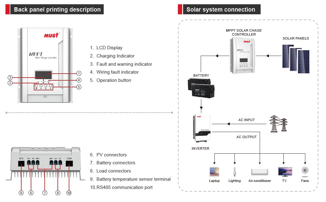24 Volt-1152WBATTERYCharging Set PointsAbsorption, FloatFlooded Battery14.2V/28.4V13.7V/27.4VAGM/GEL/LEAD (Default)14.4V/28.8V13.7V/27.4VOver-charging Voltage15.5V / 30.0VOver-charging Comeback Voltage14.5V / 29.5VBattery Defect Voltage10.0V / 17.0VTemperature Compensation Conefficient-5mv / ℃ /cell (25℃ vef)Peak Conversion Efficiency98% (MPPT Efficiency 99%)Maximum Battery Current30A40AMax Charging Current30amps continuous @ 40℃ ambient40amps continuous @ 40℃ ambientDISPLAY & PROTECTIONProtectionsSolar high voltage disconnect Solar high voltage reconnect Battery high voltage disconnect Battery high voltage reconnect High temperature disconnect High temperature reconnectMECHANICAL SPECIFICATIONSMountingWall mountMachine Dimension (W*H*D)(mm)187*255*72 (per pcs)G.W (kg)2.65OTHEREnvironmental RatingIndoorEnclosureIP30Operation Temperature Range-10~50℃Ambient Humidity0~90% relative humidity (non-condensing)Altiude≤3000m