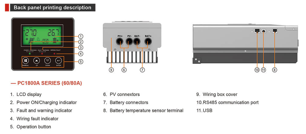 | Protections | Solar high voltage disconnect; Solar high voltage reconnect; Battery high voltage disconnect; Battery high voltage reconnect; High temperature disconnect;High temperature reconnect | |||