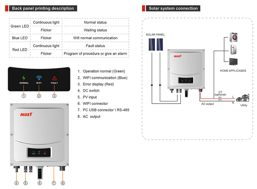 PH5000 series PV inverters take full account of the needs of end customers, with excellent performance at the same time, use LED as inverter status display, effectively improve product life. Using DSP digital control,could afford wide grid voltage range, have a full range of protection features; to maximize the benefits at the same time, greatly enhance the reliability of the product.