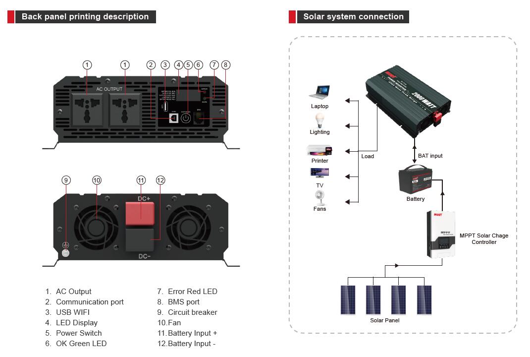 | LED Digital Display | Display Battery Voltage, Output Power, Output Voltage, Error Numbers | |||