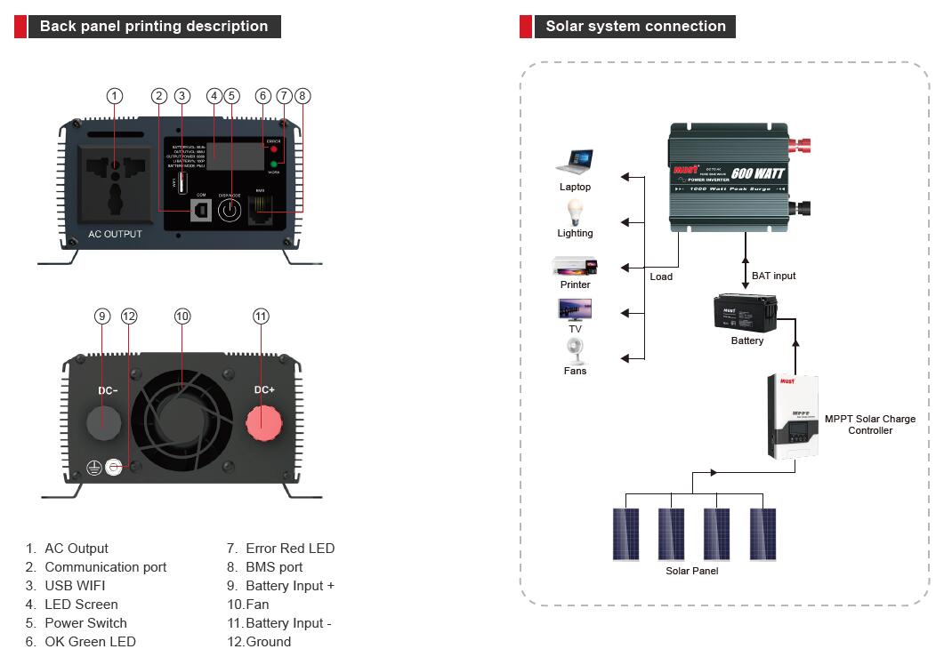 | LED Digital Display | Display Battery Voltage, Output Power, Output Voltage, Error Numbers | |||||||||||