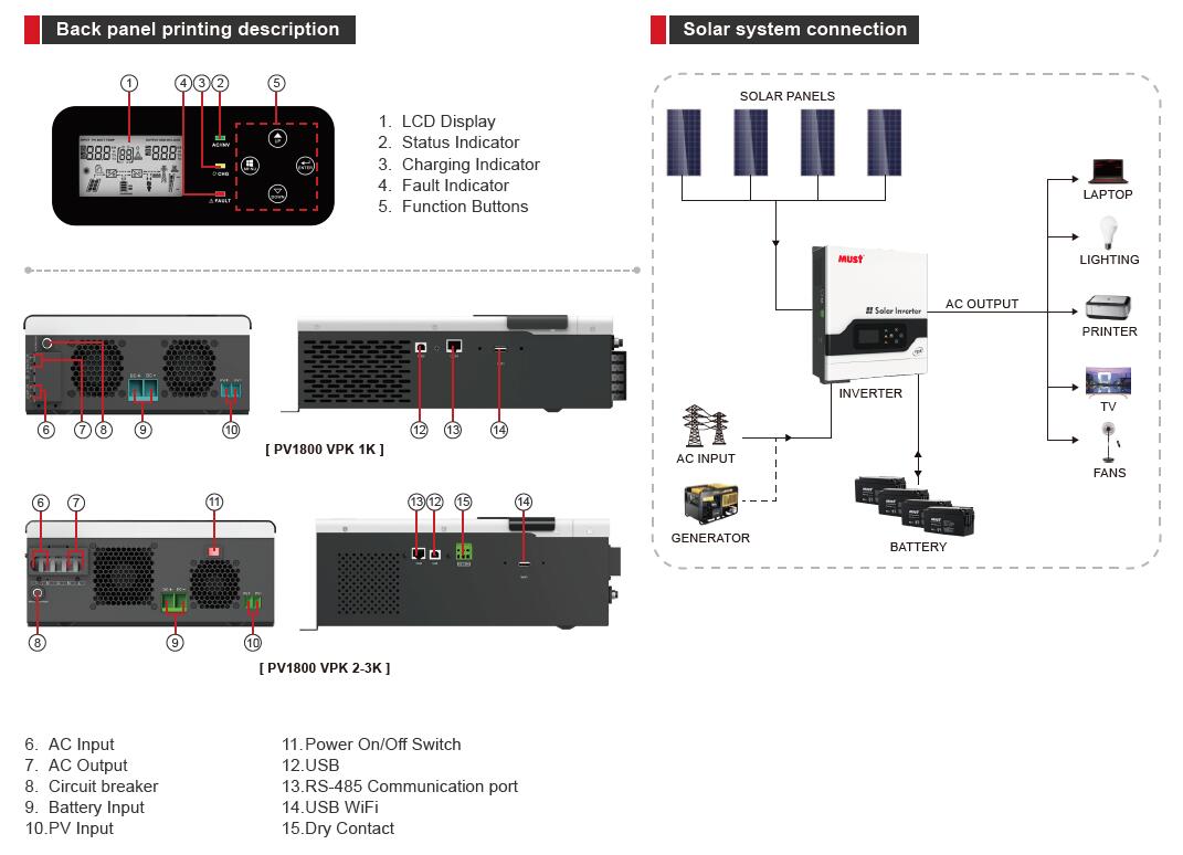 PV1800 VPK is a multi-function inverter/charger, combining functions of inverter, PWM solar charger and battery charger to offer uninterruptible power support with portable size. Its comprehensive LCD display offers user-configurable easy-accessible button operation such as battery charging current, AC/solar charger priority, and acceptable input voltage based on different applications.