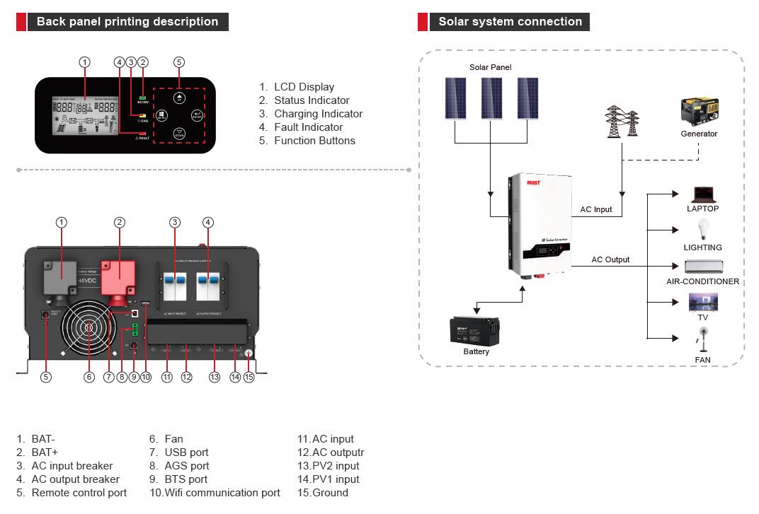 PV3600 PRO series is a multi-function inverter ,combining functions of inverter and MPPT solar charger controller, solar charger and battery charger to offer uninterruptible power support. The comprehensive LCD display offers user-configurable and easy-accessible button operation such as battery charging current, AC/solar charger priority, and selectable input voltage based on different applications.